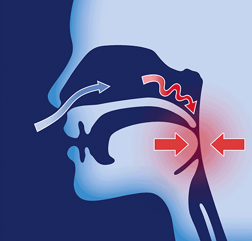 In order to continue to supply the lungs with oxygen (and avoid suffocation), the air flow is accelerated. This acceleration leads to the vibration of certain throat tissues (soft palate, uvula, tonsils, etc.), which are relaxed by sleep. This is what produces snoring.