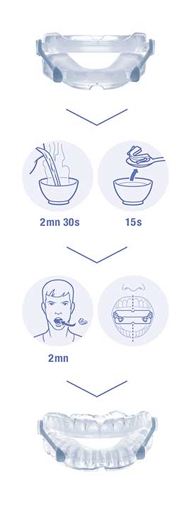 ONIRIS® is thermoformed in water. This means that after immersing it in hot water the medical materials become malleable. Simply bite down on the trays and they will fit precisely to your teeth.